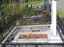 Внутрь бетонного цоколя кладём брусчатку, красим оградку, наполняем цветник корой, надписи на памятнике покрываем чёрным акрилом. Обычно мы кладём наземное покрытие так, чтобы бетонного цоколя не было видно, однако, в данном случае клиент не пожелал переустанавливать ограждение и проводить какие-либо дополнительные работы, так что брусчатка была уложена вовнутрь. Состояние места захоронения после проведения работ представлено на нижеприведённых фото.